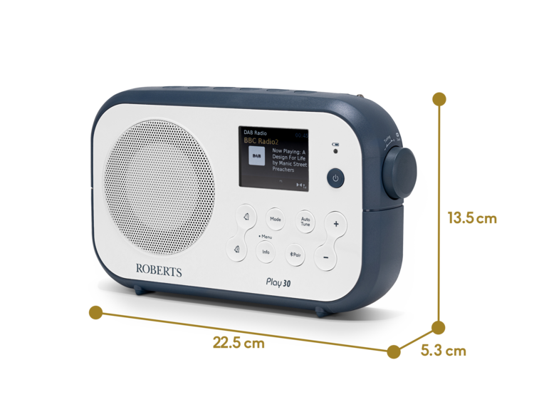 The Play 30 takes portable audio to the next level, blending a sleek and modern design with powerful functionality. Whether you’re enjoying your favourite DAB+/FM stations or streaming music via Bluetooth, the Play 30 delivers rich sound and easy access to your favourite content. With 40 preset stations and dual alarms with snooze, it’s the perfect bedside companion or on-the-go audio solution. Its exclusive White with Stone Blue accent and clear colour TFT display add style and convenience to every listening experience.